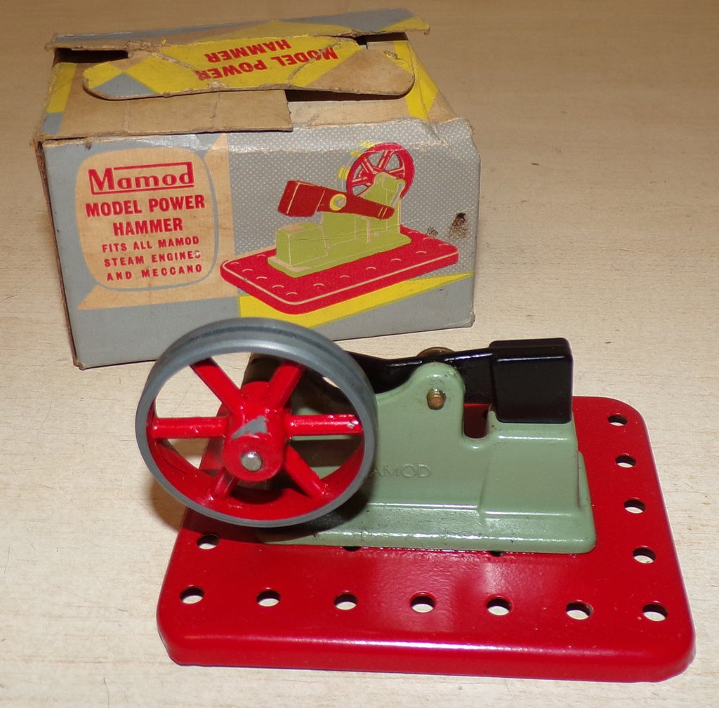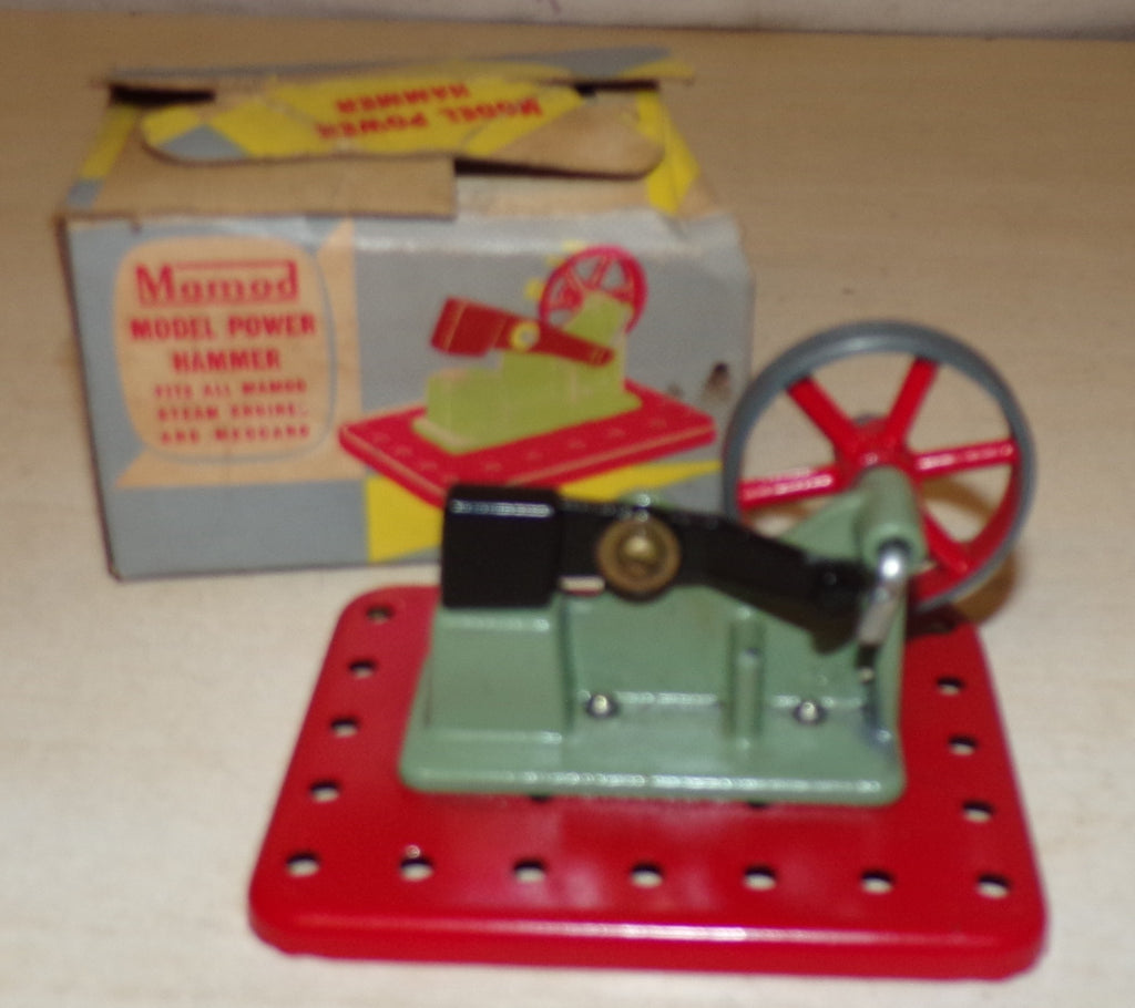 1970's Boxed Mamod trip hammer accessory, ideal for workshop diorama or being driven by an old Mamod or similar steam engine, in nice condition with some paint loss as expected for age, has box which is worn and missing flap.